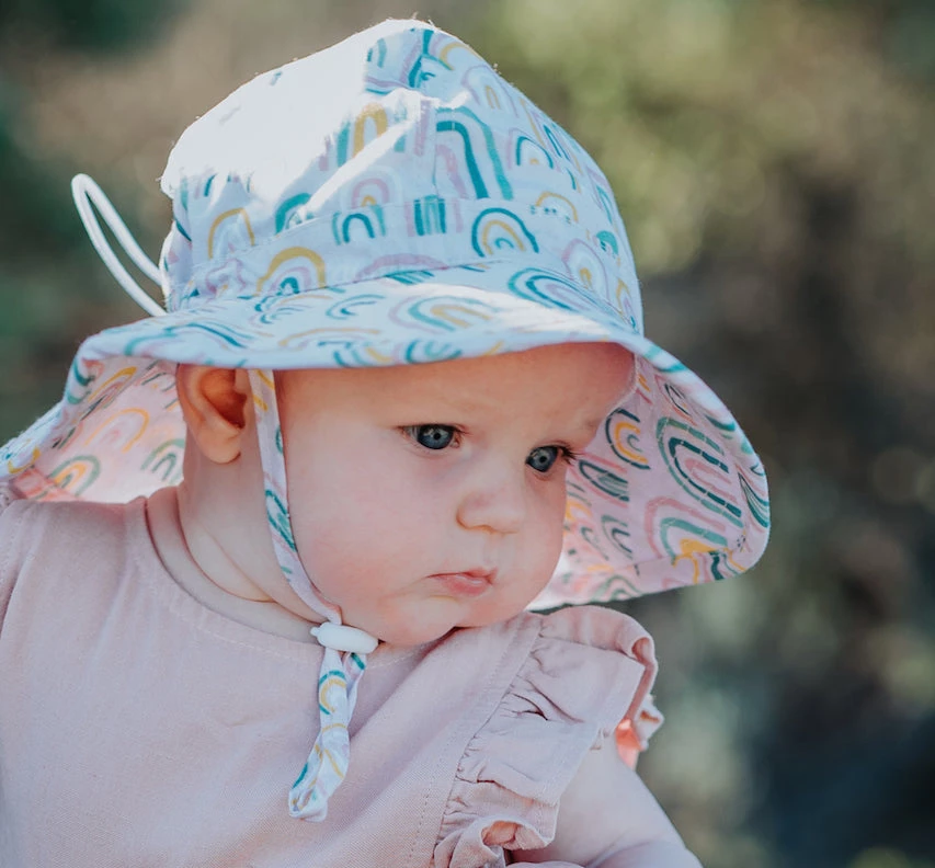 Baby sunhat with a rainbow print. Elasticated toggle around the head for the perfect fit. Cord and toggle under the chin to keep the hat in place.