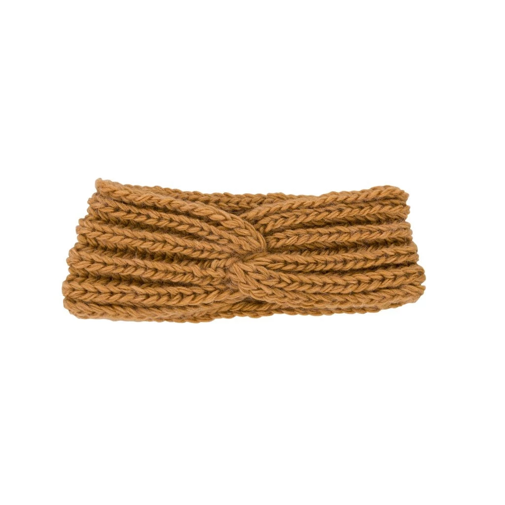 Handknitted headwrap with a ribbed stitch and cross over feature at the top of the head.