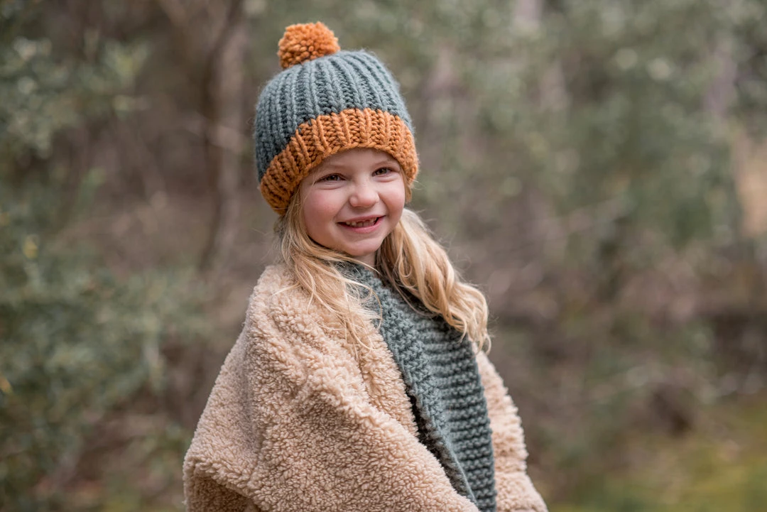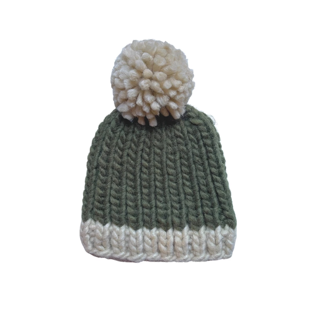 Handknitted super chunky and super stretcy knit beanie in fishermans ribbing stitch with contrast ribbing at face and super sized pom pom.