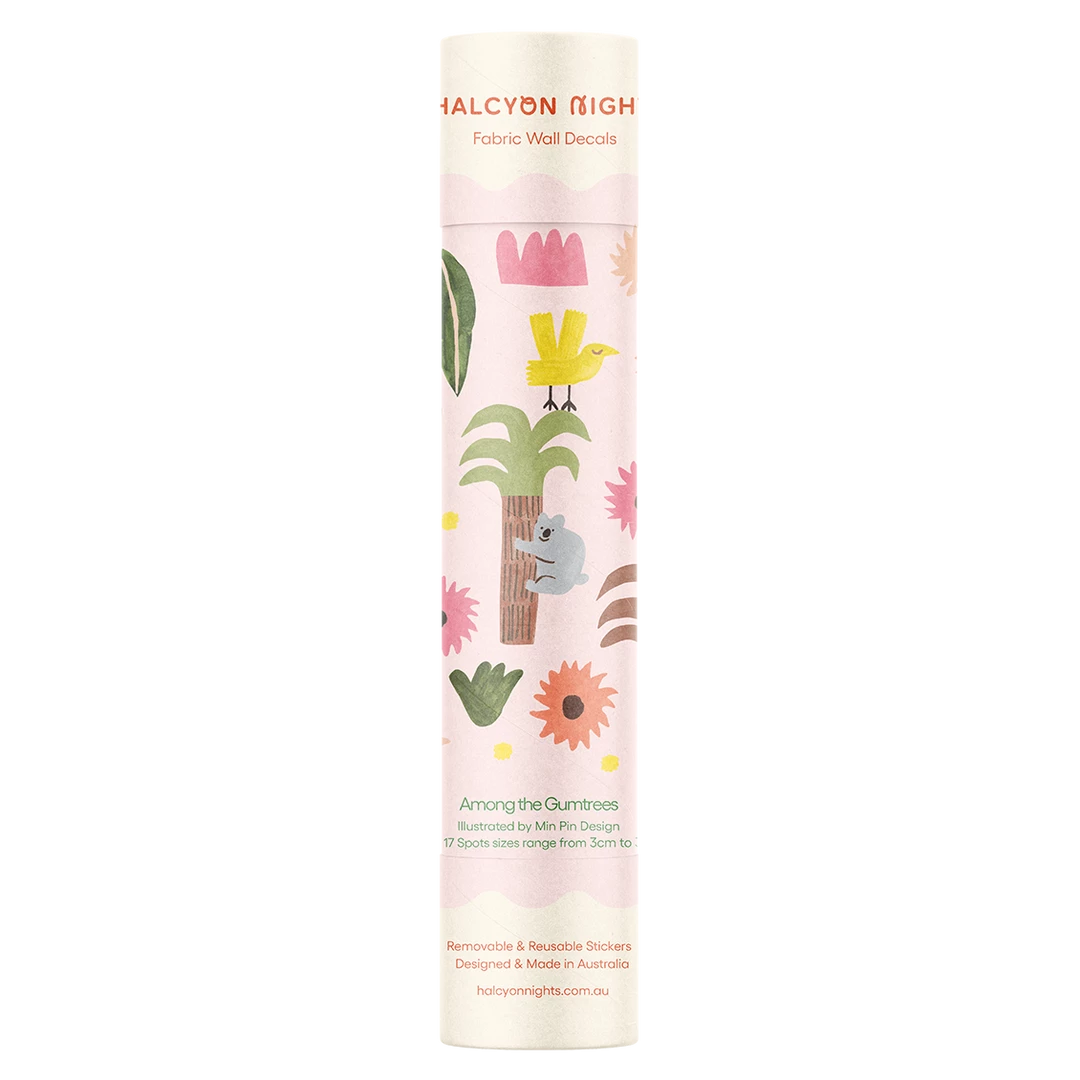 Among The Gumtrees: Illustrations by Min Pin Design. 12 removable & reusable decal shapes plus 17 coloured spots that are easy to apply and shift around as your child grows. Each measures between 3 cm – 38 cm in length.
