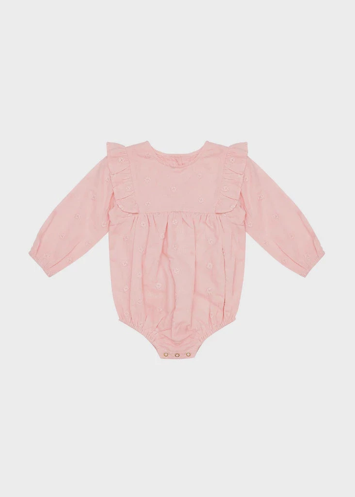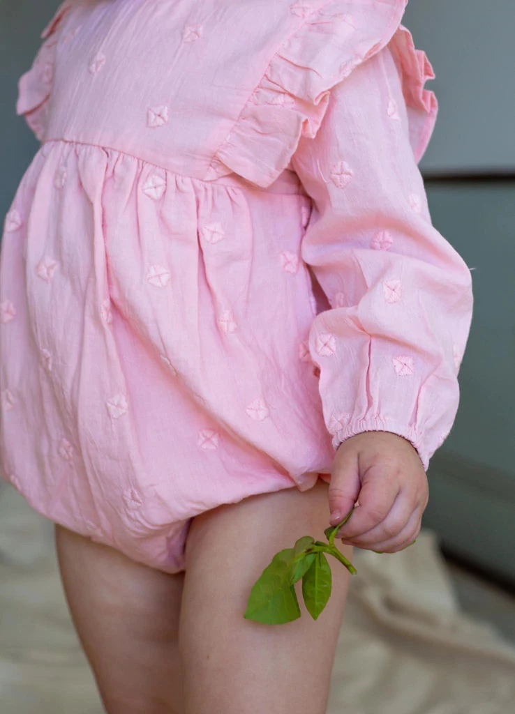 The Jessy Romper is a sweet little baby romper with long blouson sleeves and beautiful all over embroidery. It is soft cotton with soft elastic around the wrists and leg openings, gold buttons down the back and snap closures for easy changing. In a beautiful shade of pink this piece is sure to become a firm favourite.