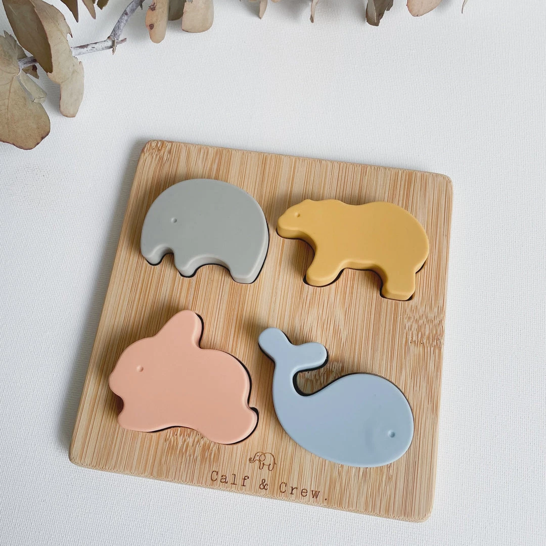 Match the animals with the correct cutout on the wooden board to complete the puzzle. A perfect early puzzle toy.