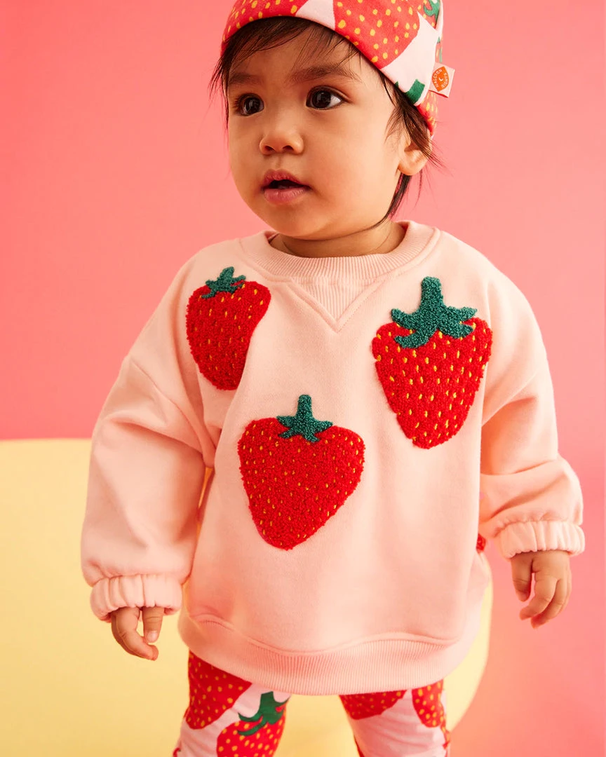 Features an oversized shape, drop waist and a friendly motif from the new Strawberry Fields collection.