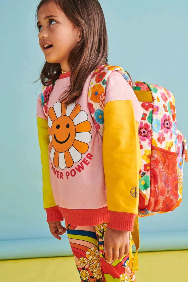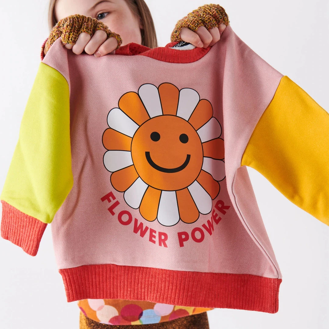 Warm up your young ones this winter in this comfy crew neck cotton fleece sweater. A wardrobe staple and easy wear item available in this Flower Power design featuring block coloured fleece with smiling daisy placement print.