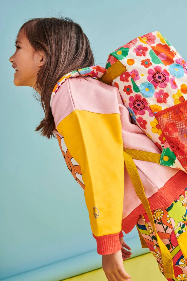Introducing Kip and Co’s new kids backpacks! Bringing a little bit of joy to the school routine, our handy backpacks can fit kid’s books, jumpers and a lunchbox! And can double up as a weekender for sleepovers and adventures. Featuring funky coloured florals on a pale pink base with cherries and rainbow heart embroidered badges.