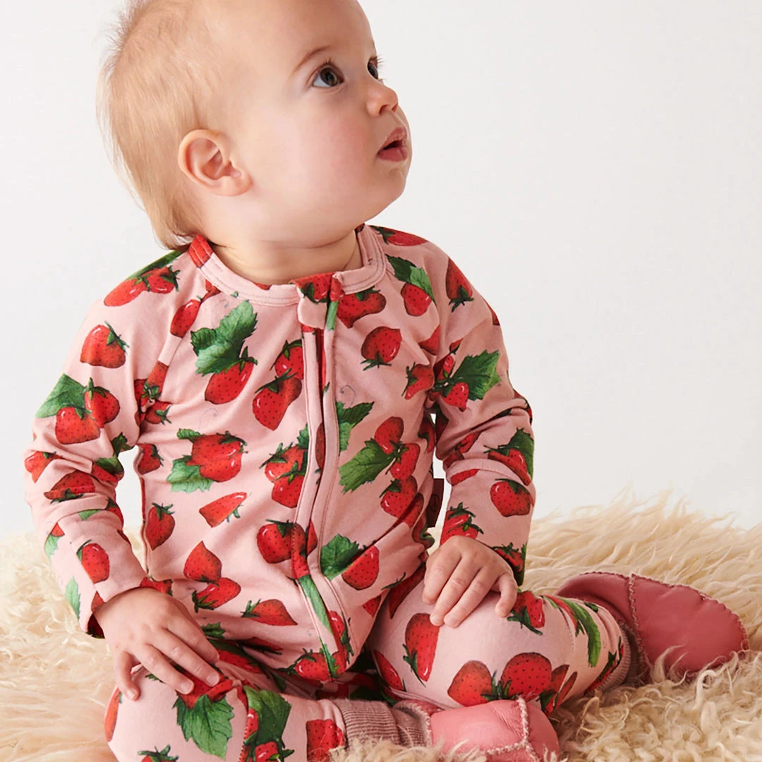 Illustrated plump strawberries on a pink base. 100% GOTS certified organic cotton. Packaged in re-useable self fabric drawstring bag.