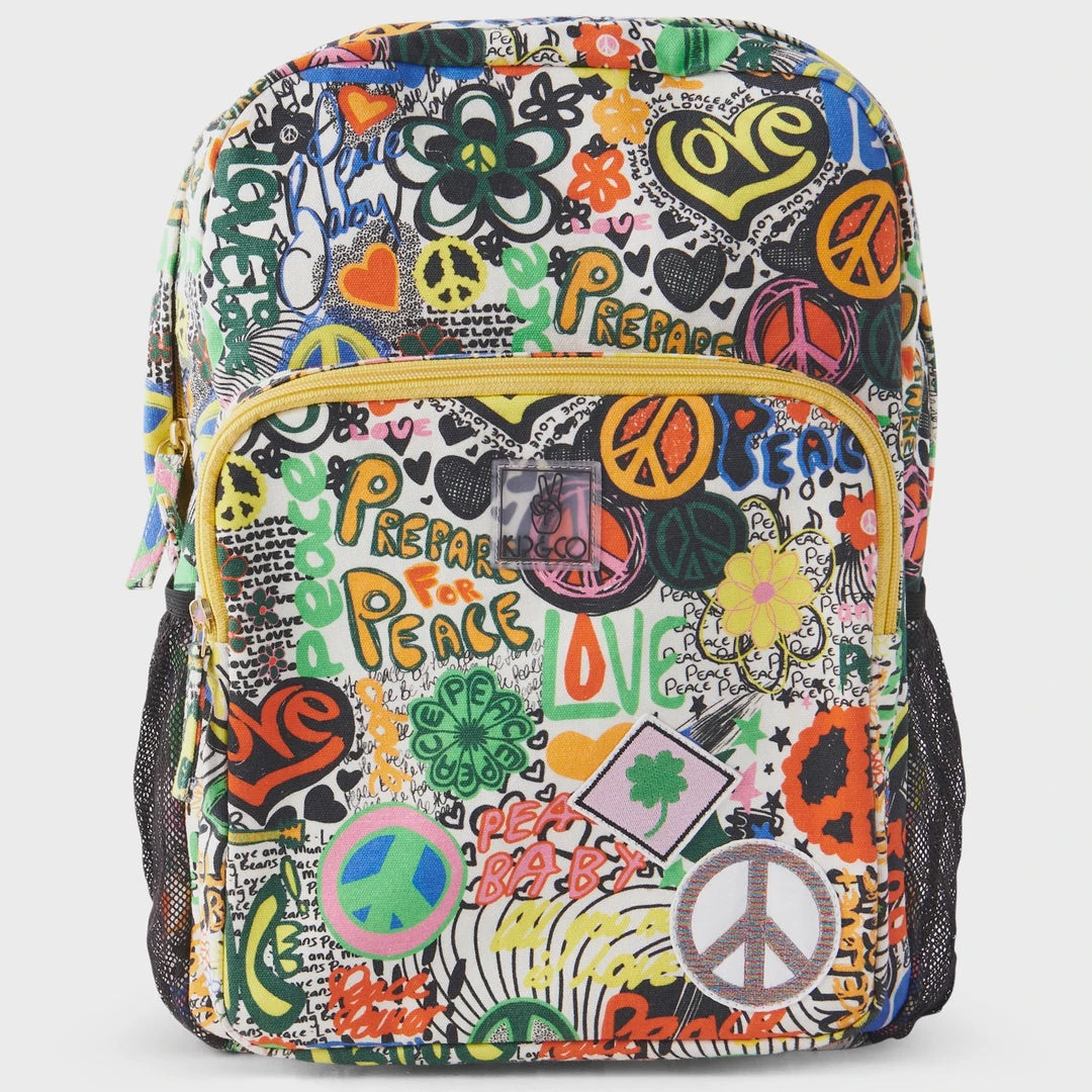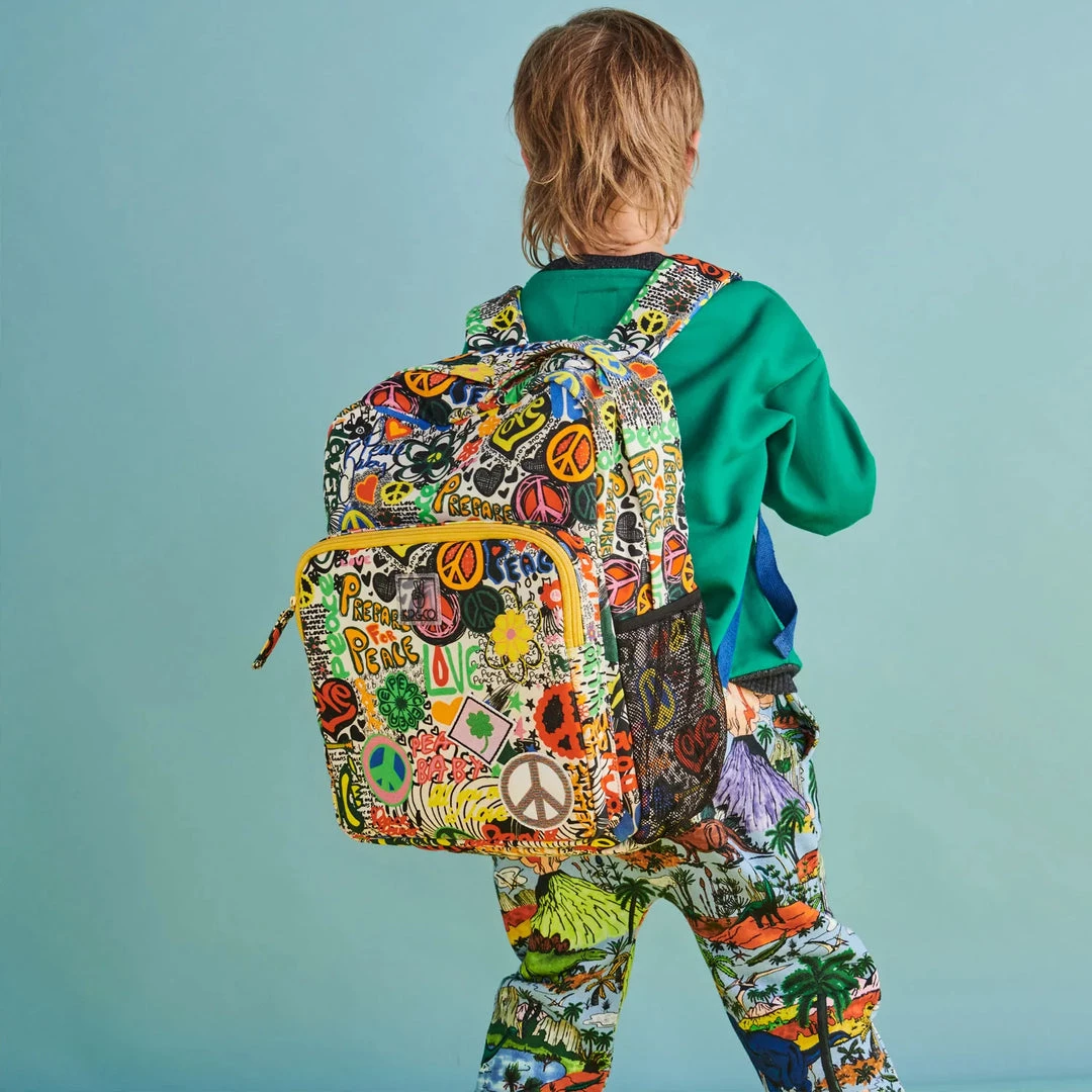 Introducing Kip & Co’s new kids backpacks! Bringing a little bit of joy to the school routine, our handy backpacks can fit kid’s books, jumpers and a lunchbox! And can double up as a weekender for sleepovers and adventures. Featuring a peace and love all over print with four leaf clover and peace symbol embroidered badges.