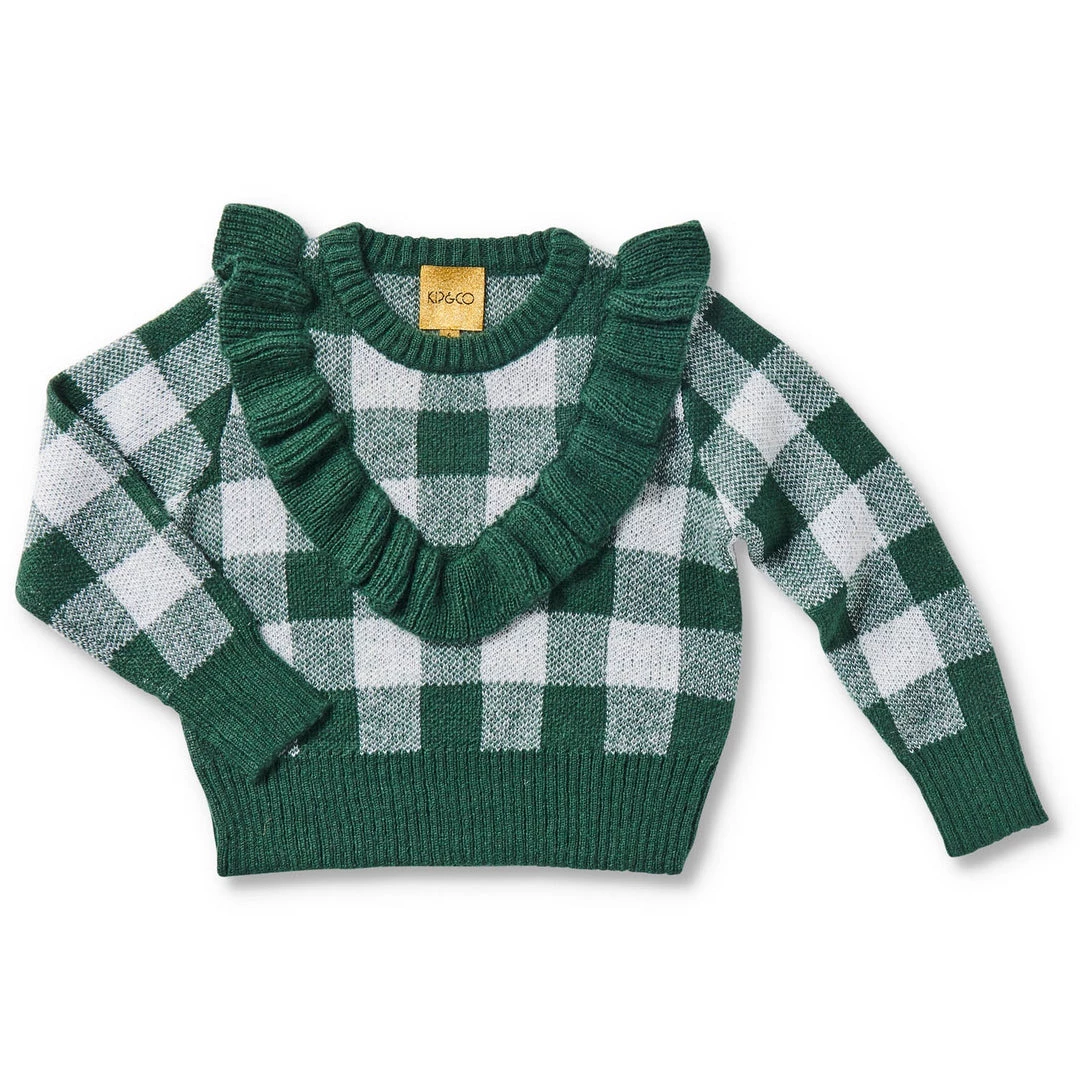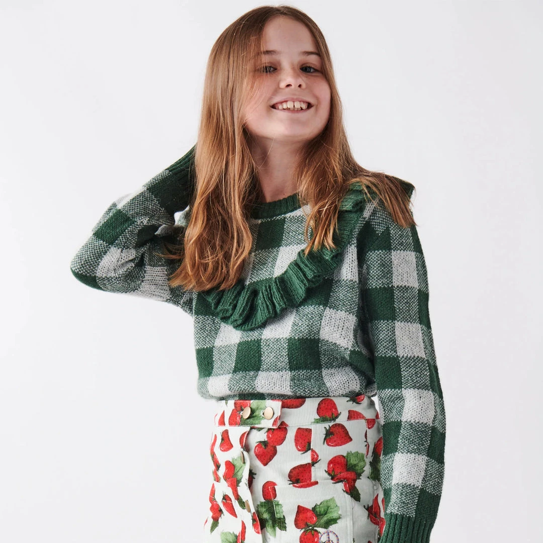 Knitwear is such an important part of a winter wardrobe. Get the kids feeling cosy and warm in this Pine Tartan Frill Knit Sweater. Non-scratchy super soft wool blend knit in chunky pine green and white gingham with green frill v-neck detail.
