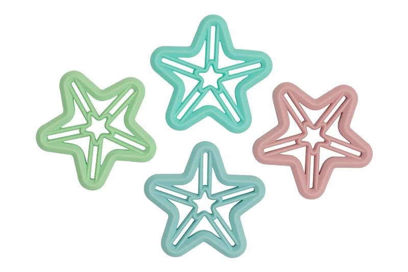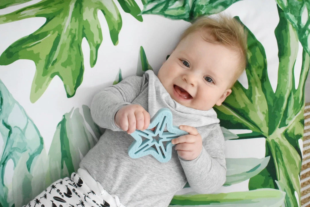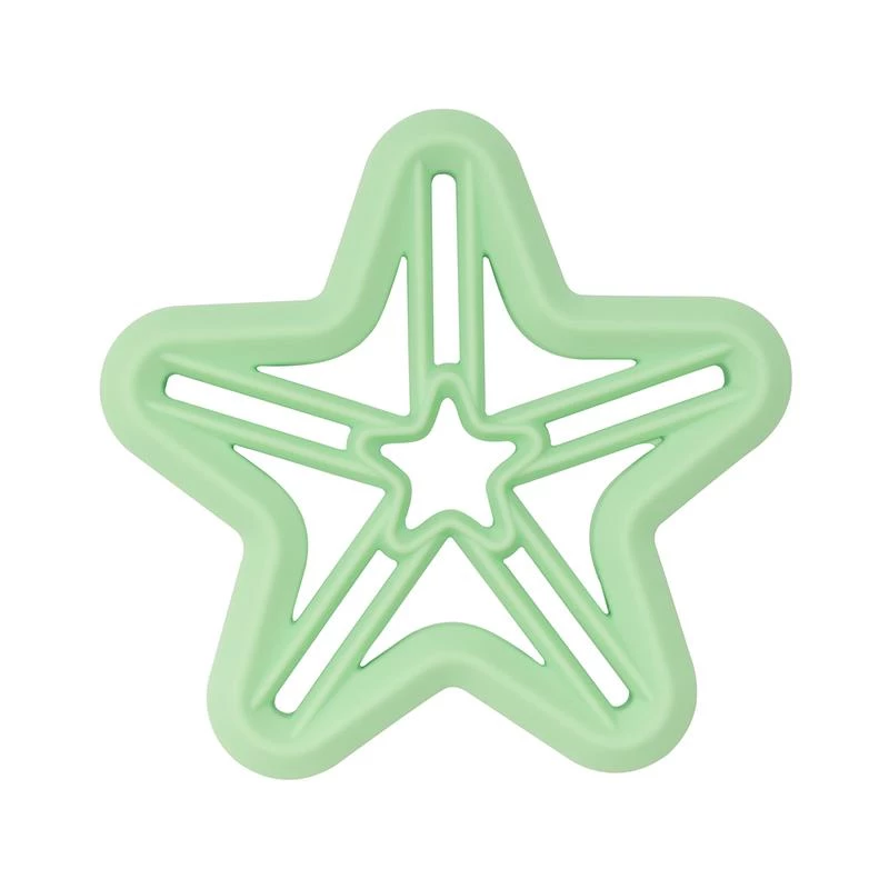 Made from beautiful, soft and flexible food grade silicone the open points of our star silicone teether are textured and shaped to keep little hands active and soothe sore gums. The star shape has been specifically designed to be easily manipulated by little fingers to rub against gums or push against back molars. All these combine to help relieve the stress and discomfort of teething.