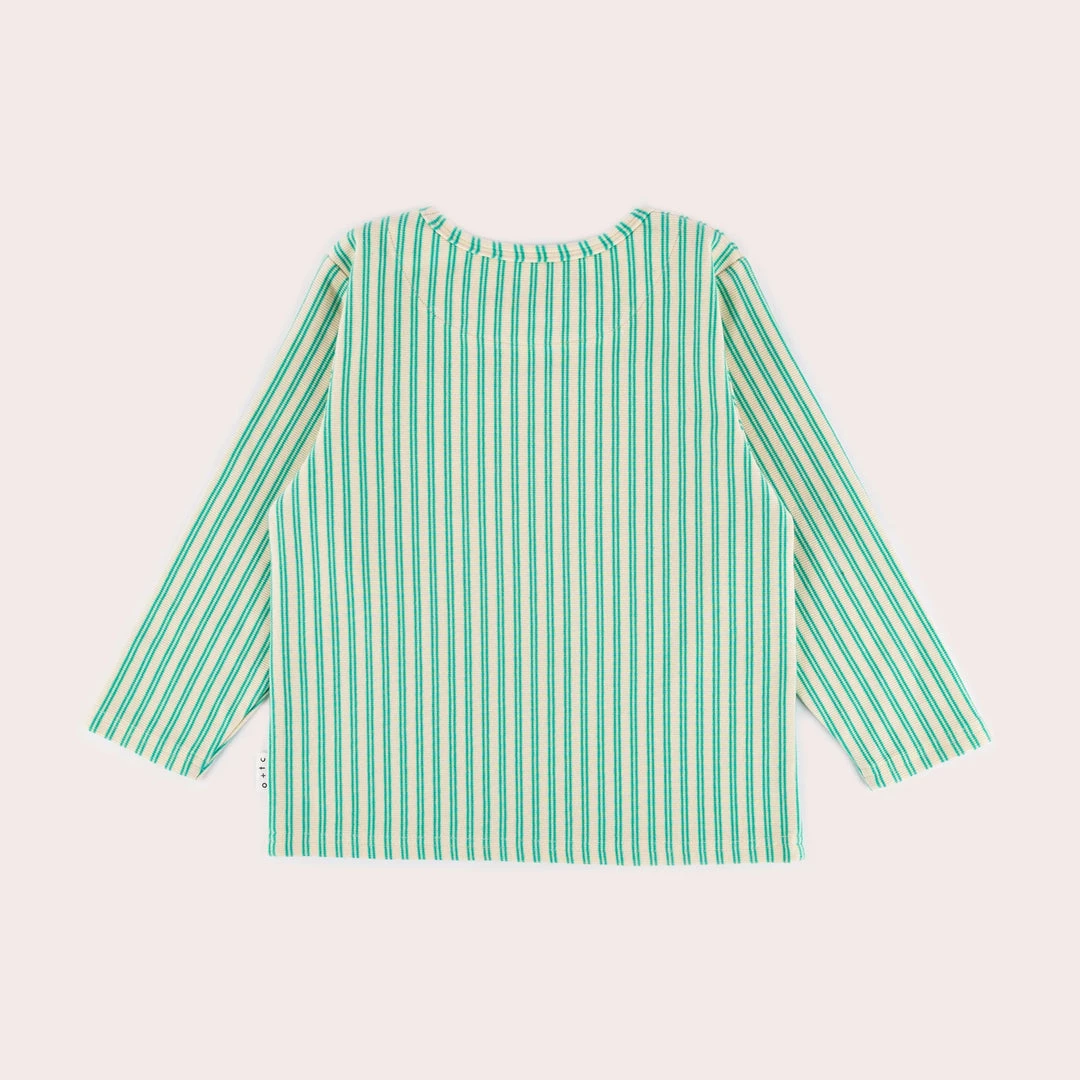 Classic turquoise stripes on a slightly textured (yet super soft!) cream base, featuring vibrant bright blue print.