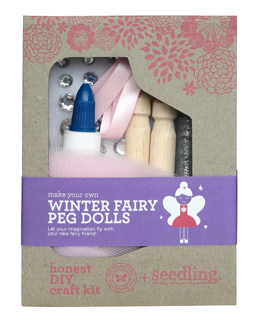 The Seedling Winter Fairy Peg Doll kit lets imaginations soar by creating a little peg dolls and turning them into a beautiful fairies.