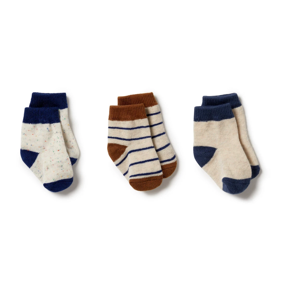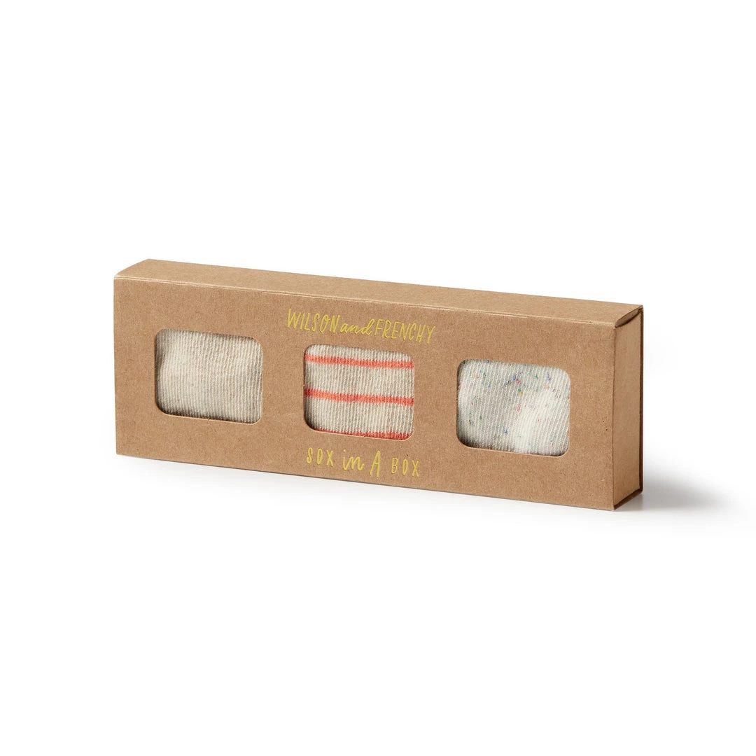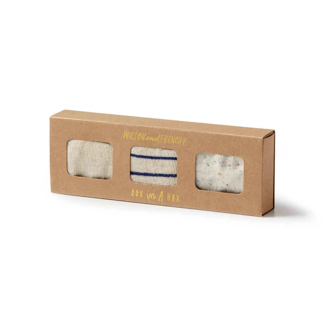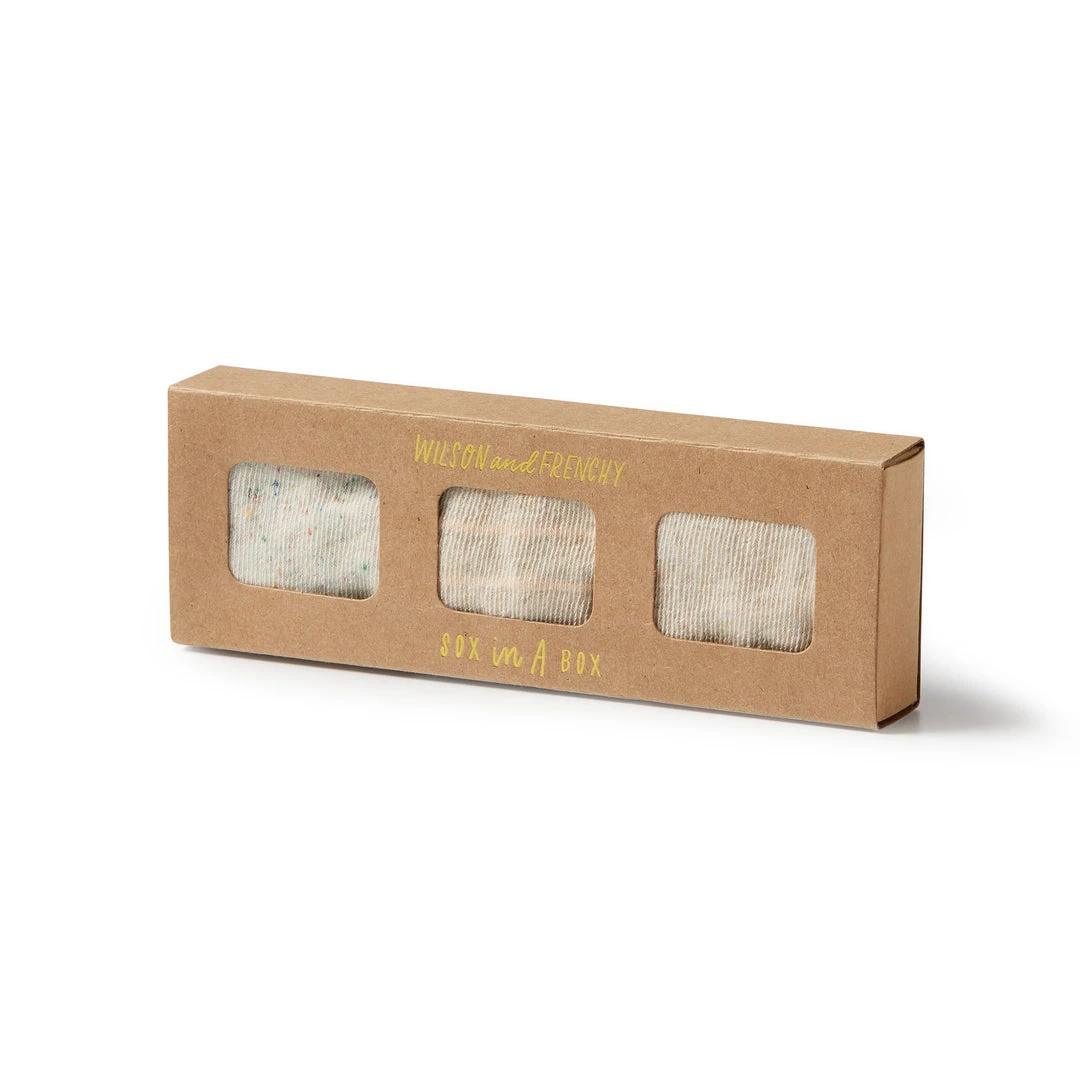 Keep little feet warm with this 3-pack of socks with non-slip soles. Beautifully packaged in a recyclable box. Fabric Composition: 78% cotton, 20% nylon, 2% elastane. Gentle machine wash. Made in Taiwan.